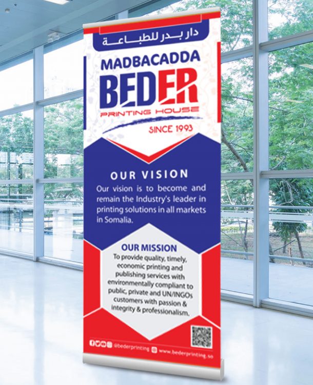 Beder Printing House (BPH) was incorporated 1993 in a small office at Howl Wadag District of Mogadishu with small and manually operated machines. Over the years, the Company has evolved through historical milestones. At the moment, BPH operates on modern and sophisticated machinery with international experts with high caliber on designing, drawing, printing and publications. BPH offers high quality services with affordable prices coupled with guaranteed and services after sales/delivery.